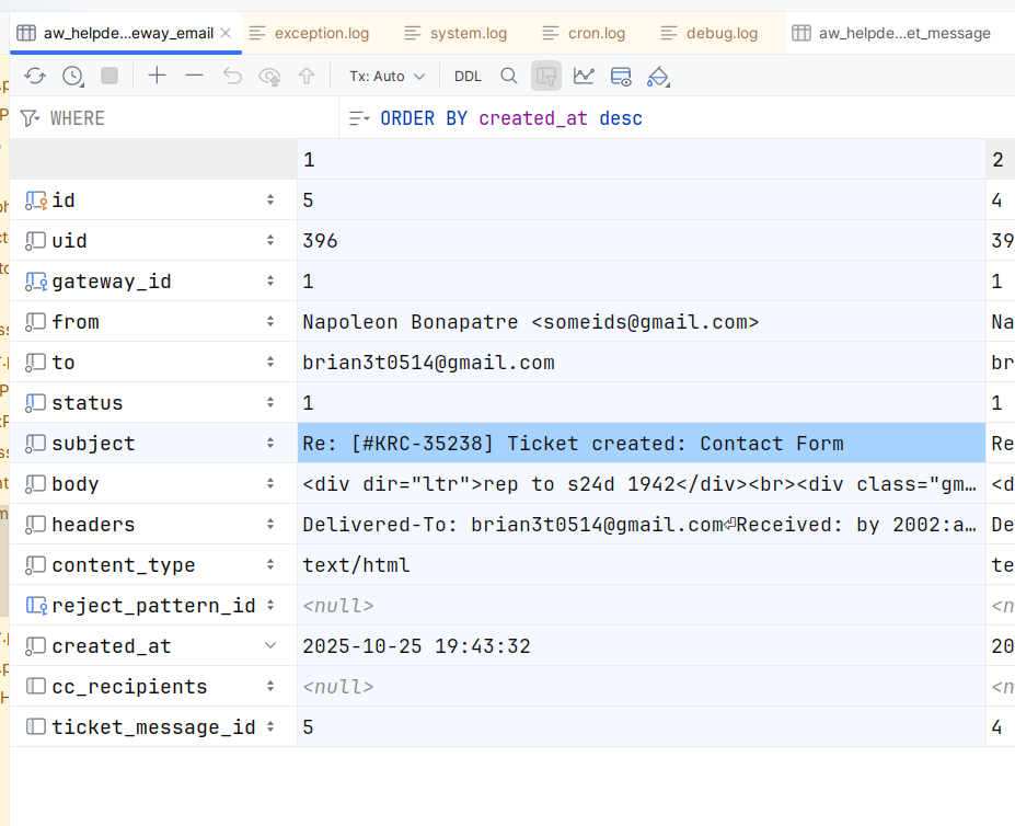 Another cron job, `aw_helpdesk2_process_email` processed that email and marked it with status 1