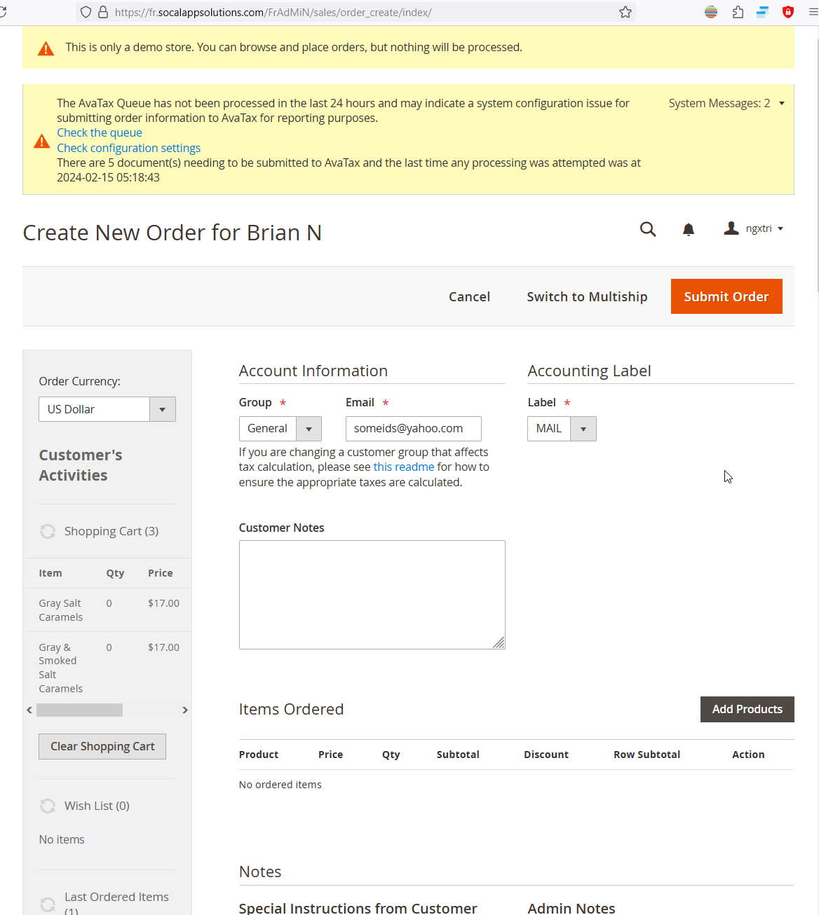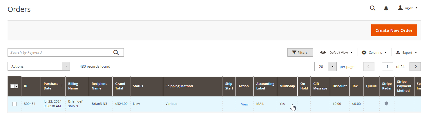 Confirm the order is created, and its status should be `New`. In the `Orders` grid; the column `Multiship` is Yes