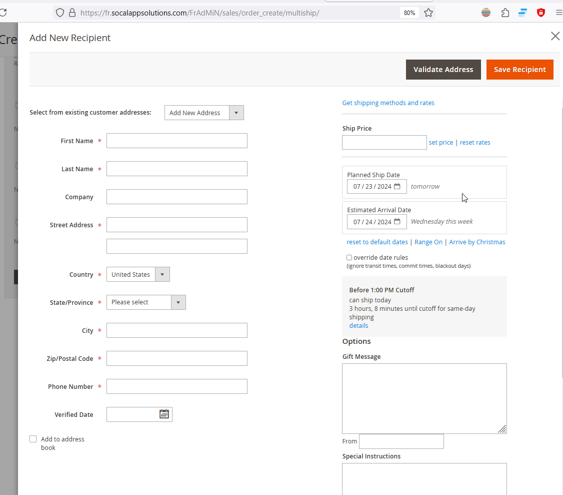 In the popup the add new recipient, choose an existing address; or add new address. Click Get Shipping Methods And Rates and confirm the shipping method. When done, click `Save Recipient`.