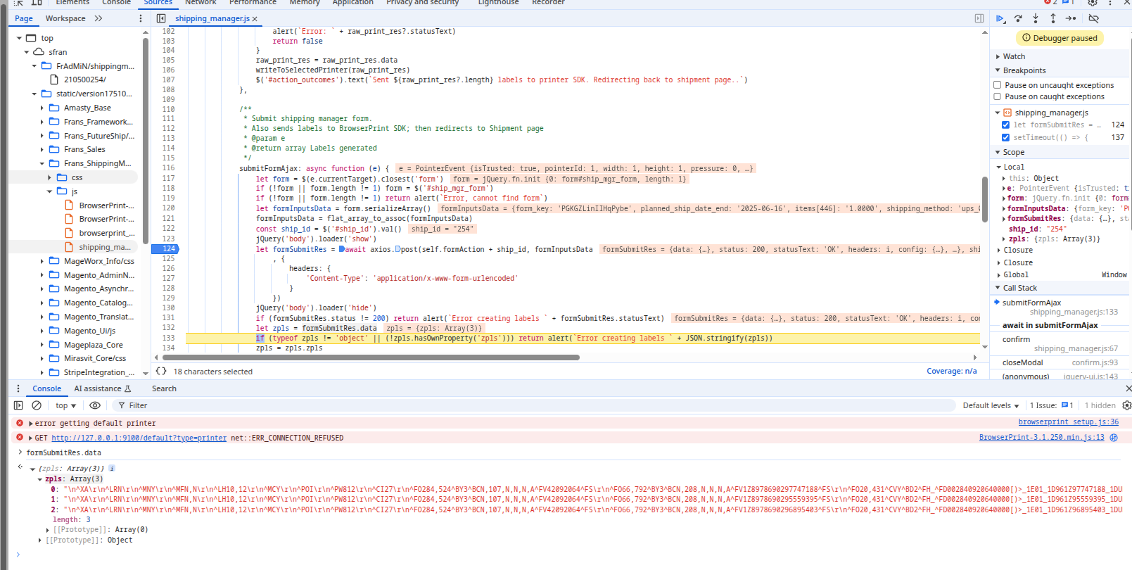 With the 3 zpls returned, js function writeToSelectedPrinter(zpls) is called. This function sends 3 zpl labels to the BrowserPrint SDK